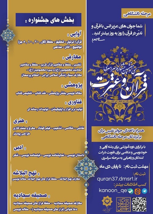 برای کسب اطلاعات بیشتر، شیوه‌نامه‌ی الصاقی را مطالعه کرده و به کانال کانون قرآن و عترت دانشگاه در پیام‌رسان ایتا , بله و تلگرام مراجعه فرمایید :