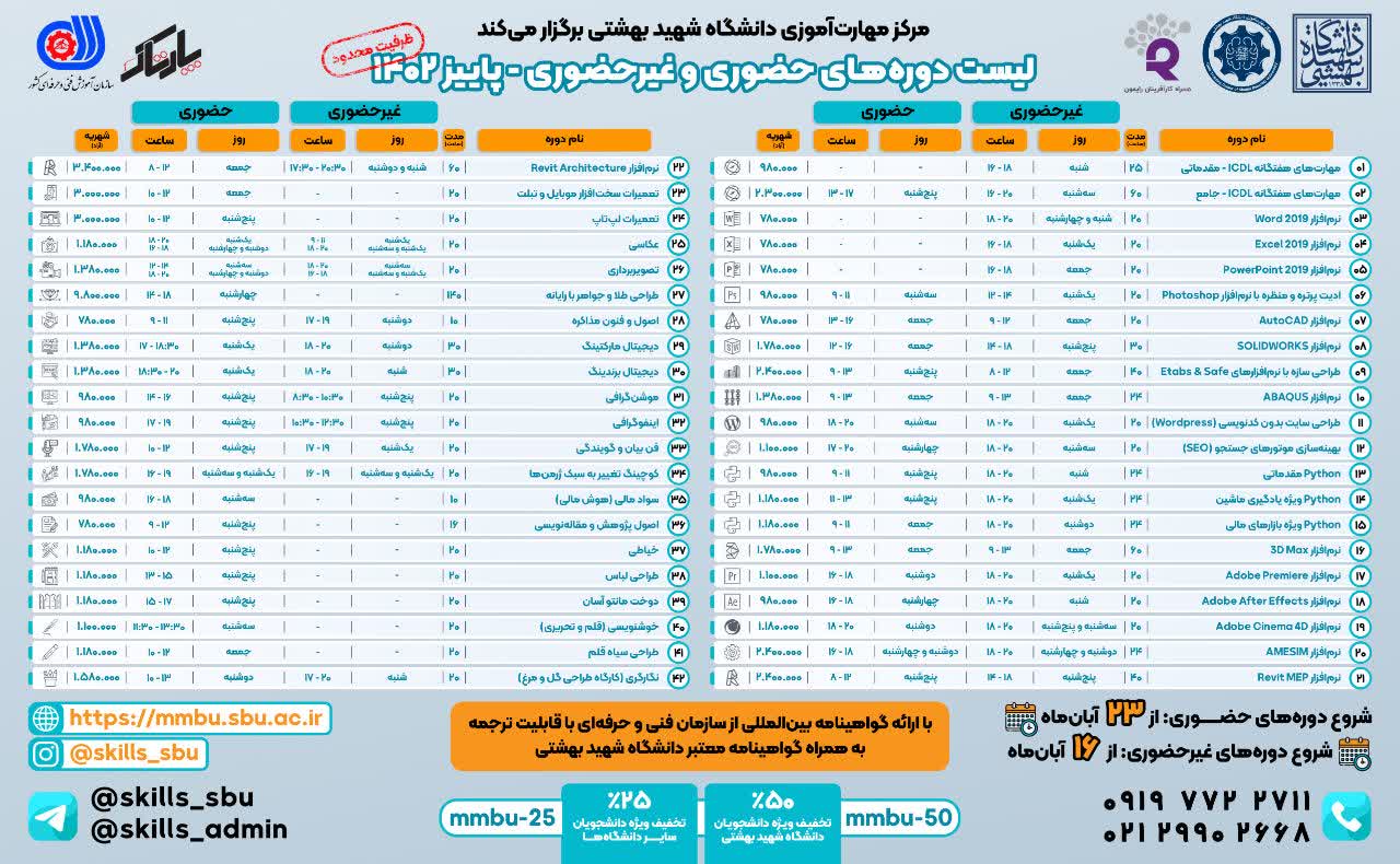 دوره‌های حضوری و غیرحضوری پاییز ۱۴۰۲ توسط مرکز مهارت‌آموزی دانشگاه شهید بهشتی برگزار می‌شود،
