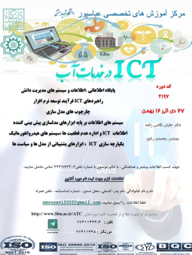 صفحه اصلی دوره آموزشی نقش ICT در خدمات آب 2347 بازدید print share دوره آموزشی نقش ICT در خدمات آب مر کز آموزشهای تخصصی دانشگاه در نظر دارد دوره آموزشی " نقش ICT در خدمات آب " را برگزار نماید ؛...